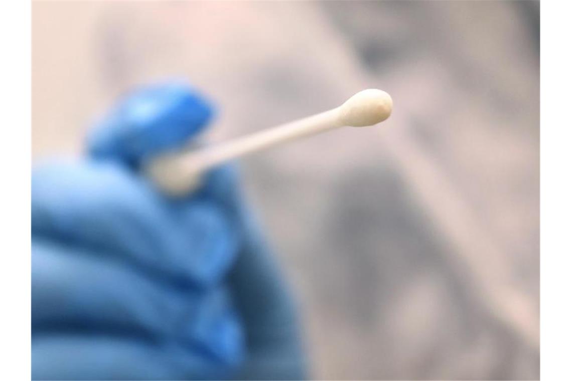Ein Arzt hält einen Tupfer, mit dem ein Abstrich für einen Coronatest gemacht wird. Foto: Karl-Josef Hildenbrand/dpa/Symbolbild