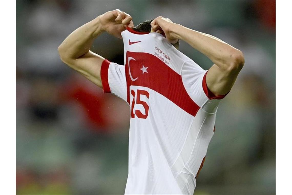 Verkriechen möchte sich der türkische Nationalspieler Mert Müldür in der Begenung gegen die Schweiz in Baku. Die Türken haben auch das dritte Vorrundenspiel verloren und sind sang- und klanglos ausgeschieden. Foto: Ozan Kose/AFP Pool/dpa