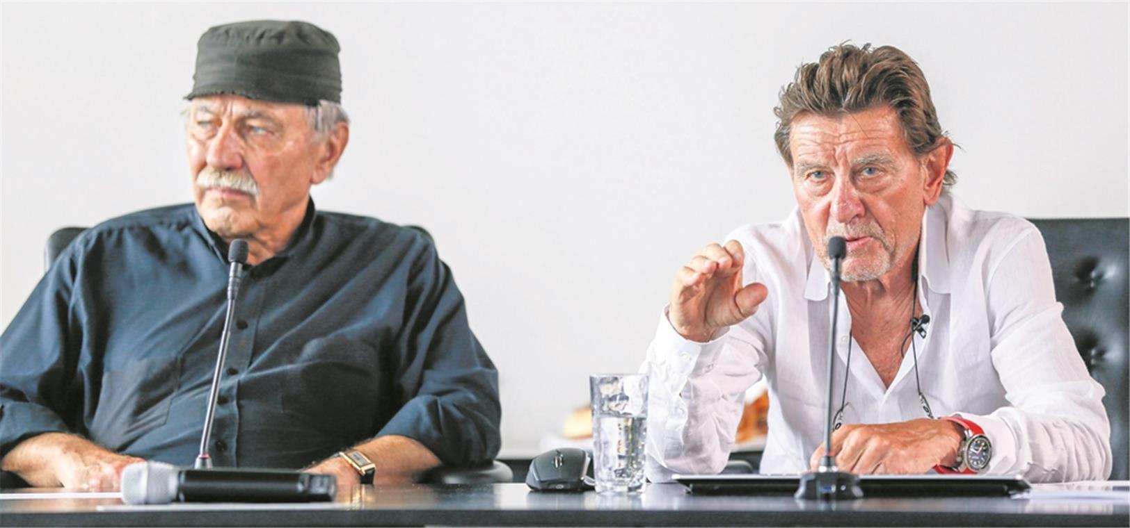 Architekt Helmut Jahn (rechts) erläutert die Pläne, die er zusammen mit Riva-Chef Hermann Püttmer in Backnang verwirklichen will. Foto: A. Becher