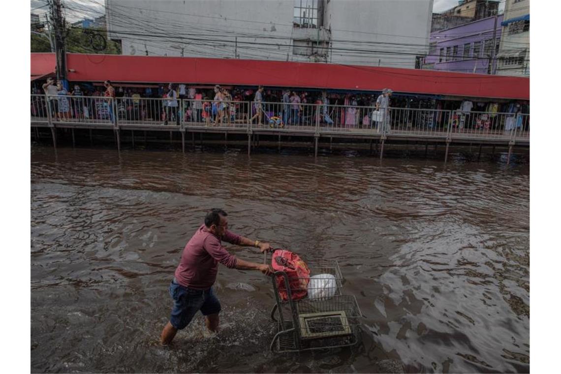 Ein Mann schiebt einen Einkaufswagen durch eine überschwemmte Straße in Manaus. Foto: Lucas Silva/dpa