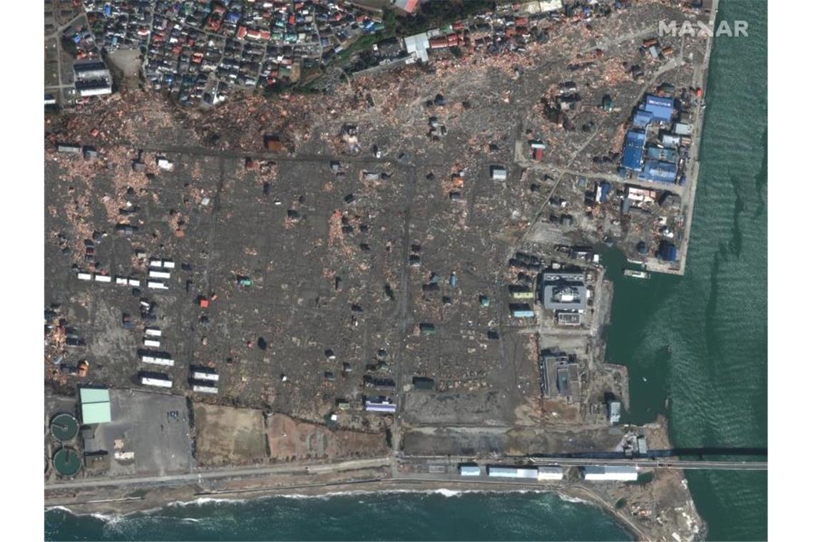Dieses Satellitenbild zeigt das Ausmaß der Zerstörung infolge des schweren Erdbebens in Ishinomaki. Foto: Uncredited/Maxar Technologies/dpa