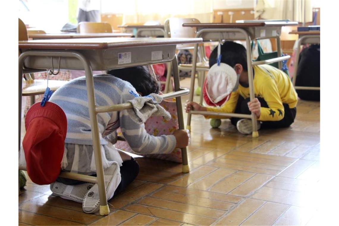 Grundschüler suchen während einer Erdbeben-Notfallübung in Usuki Schutz unter ihren Tischen. Foto: -/kyodo/dpa