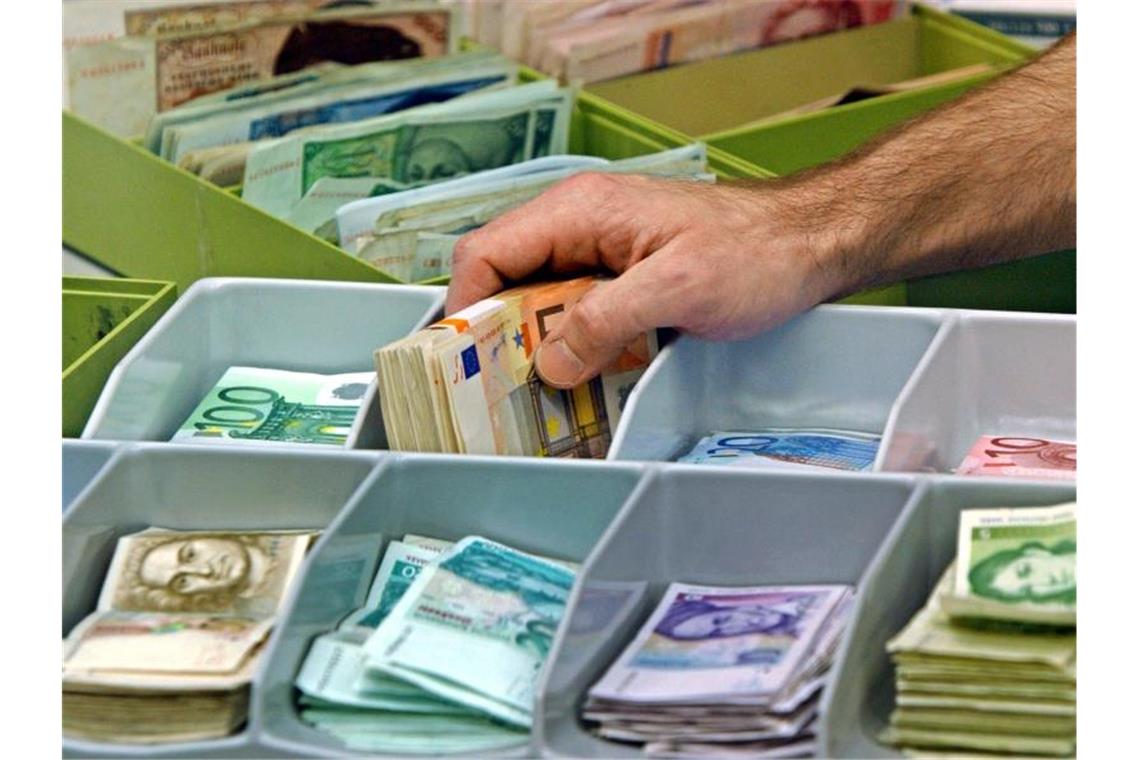 Euro- und D-Mark-Banknoten in der Landeszentralbank in Frankfurt am Main. Die D-Mark ist weiter in den Köpfen der Bürger präsent. Foto: Frank May/dpa