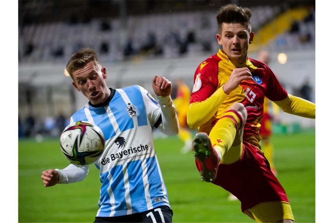Fabian Greilinger (l) von München und Marvin Wanitzek von Karlsruhe kämpfen um den Ball. Foto: Sven Hoppe/dpa