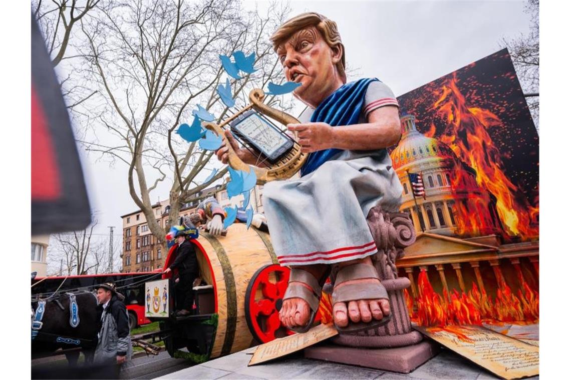 Donald „Nero“ Trump twittert mit seiner Harfe. Foto: Andreas Arnold/dpa