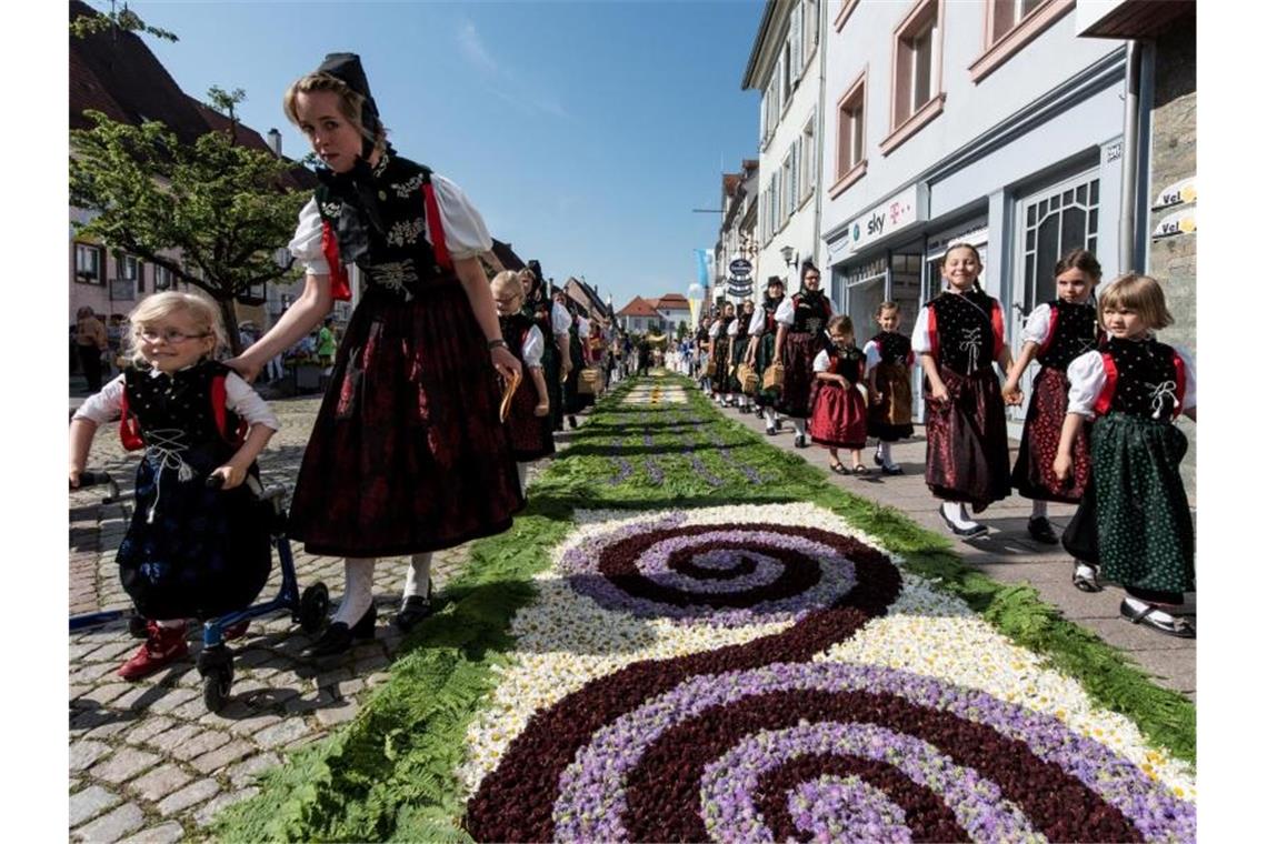 Trachtenträgerinnen in Hüfingen neben einem traditionellen Blumenteppich. Foto: Patrick Seeger/Archivbild