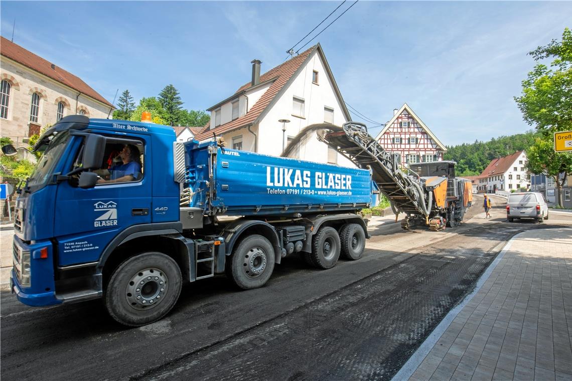 Ein neuer Fahrbahnbelag für die Spiegelberger Ortsdurchfahrt: Seit gestern ist die L1066 wegen der abschließenden Arbeiten an der sanierungsbedürftigen Straße voll gesperrt. Manche Fahrer versuchen es trotz des Verbots mit einem Durchkommen. Foto: A. Becher