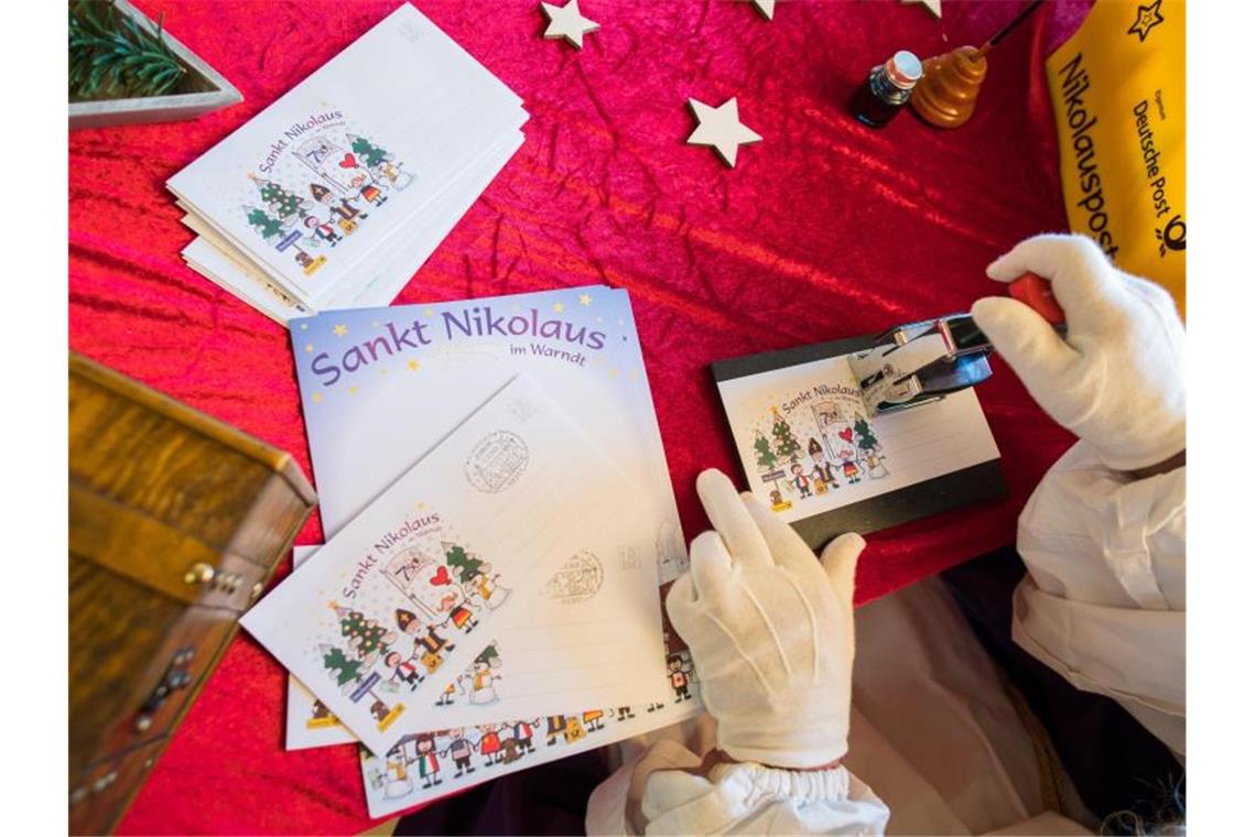 Der Nikolaus stempelt in der Nikolaushütte einen Brief ab. Foto: Oliver Dietze/dpa
