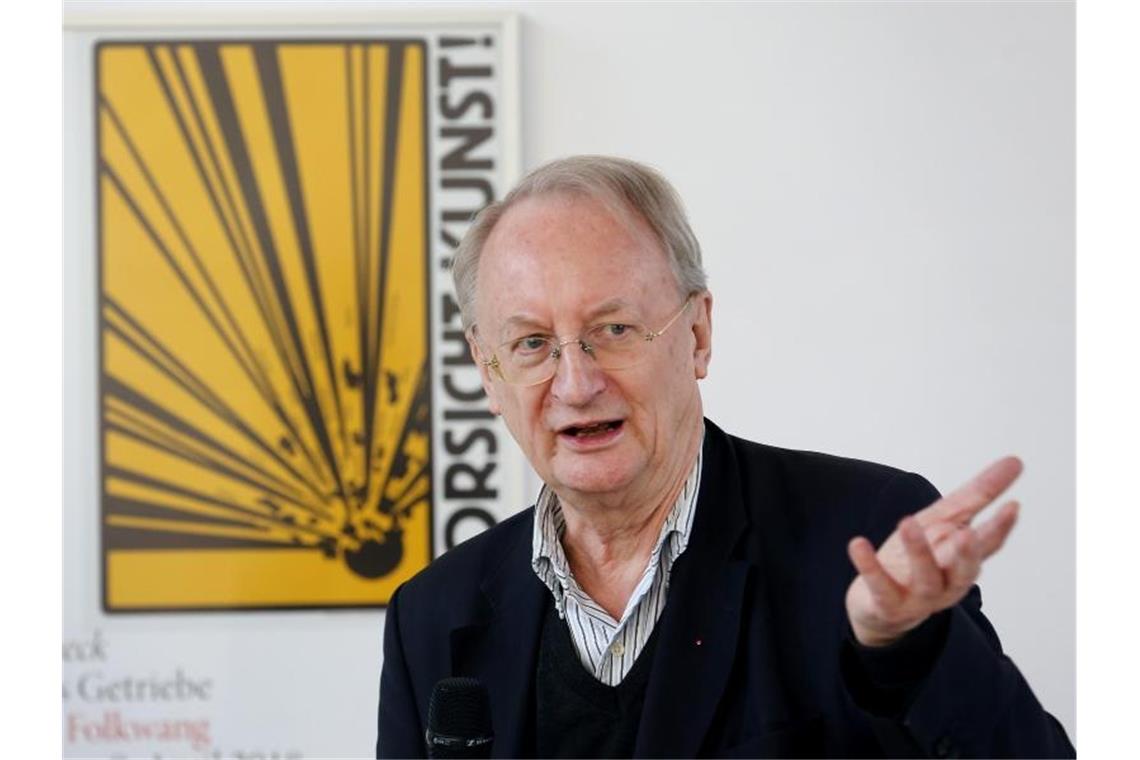 Der Künstler Klaus Staeck spricht bei einer Pressekonferenz. Foto: Roland Weihrauch/dpa/Archivbild