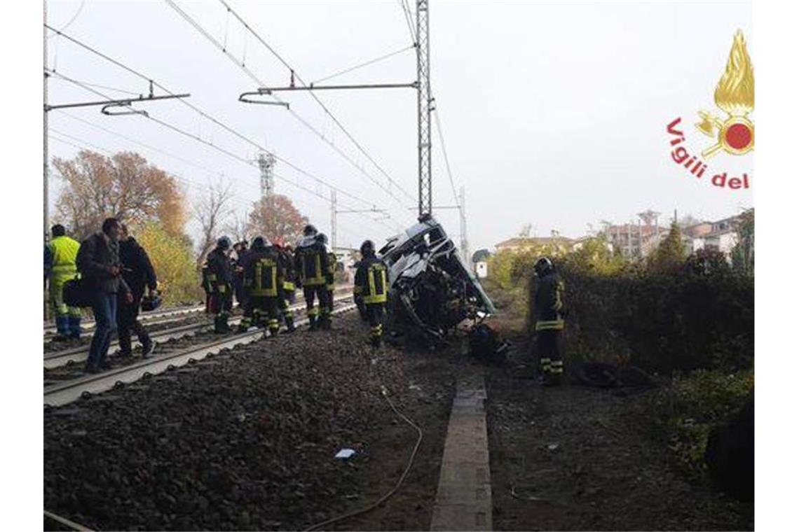 Handout der italienischen Feuerwehr zeigt einen Blick auf die Unfallstelle. Ein Kleinbus war von der Fahrbahn abgekommen, auf Bahngleise geraten und von einem Zug erfasst worden. Foto: -/Vigilfuoco.it/dpa
