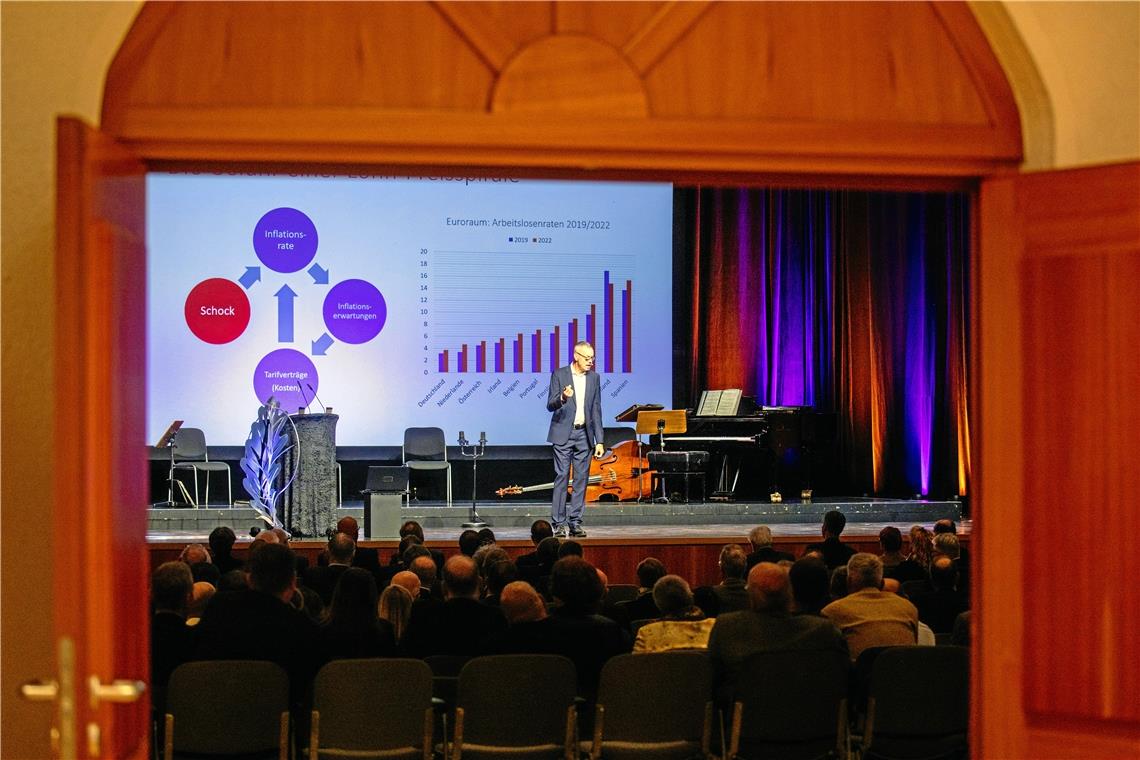 Backnang. Nach dem Walzer „Wein, Weib und Gesang“ in die nüchterne Welt der Ökonomie einzusteigen, das habe schon etwas von einem Kulturschock, schmunzelte Peter Bofinger. Den hatte der 67-Jährige aber schnell überwunden und lieferte den Zuhörern harte Fakten. Der deutschen Wirtschaftspolitik in der Coronakrise stellte er ein gutes Zeugnis aus: „Das haben wir insgesamt nicht schlecht gemacht“, so der Ökonom. Durch Kurzarbeitergeld, Überbrückungshilfen und dergleichen seien wirtschaftliche Folgen abgemildert worden. Und auch dem Angstthema Inflation nahm er bei seinem Vortrag im Bürgerhaus den Schrecken: Die Prognosen der Forschungsinstitute besagten allesamt, dass der Spuk 2023 schon wieder vorbei sei. „Wir sind verwöhnt, was das angeht, deswegen reagieren wir etwas sensibler.“