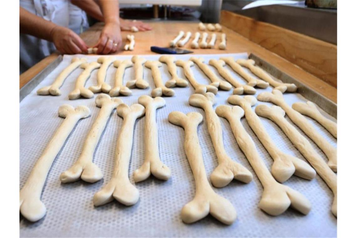 Annette Kuri, Bäckereigehilfin, formt in der Backstube Laugengebäck in Knochenform. Foto: Karl-Josef Hildenbrand/dpa