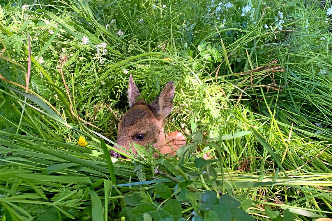 Rehkitze verhalten sich im Gras vollkommen ruhig, sind kaum zu sehen und geraten so schnell unter ein Mähwerk. Foto: Flugmodus e.V.