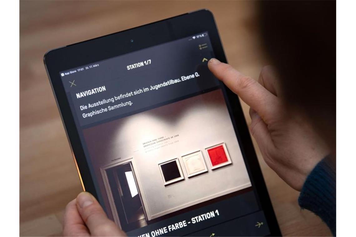 Eine Frau hält ein Tablet in der Hand, auf dem die App der Mannheimer Kunsthalle zu sehen ist. Foto: Marijan Murat/dpa/Archivbild
