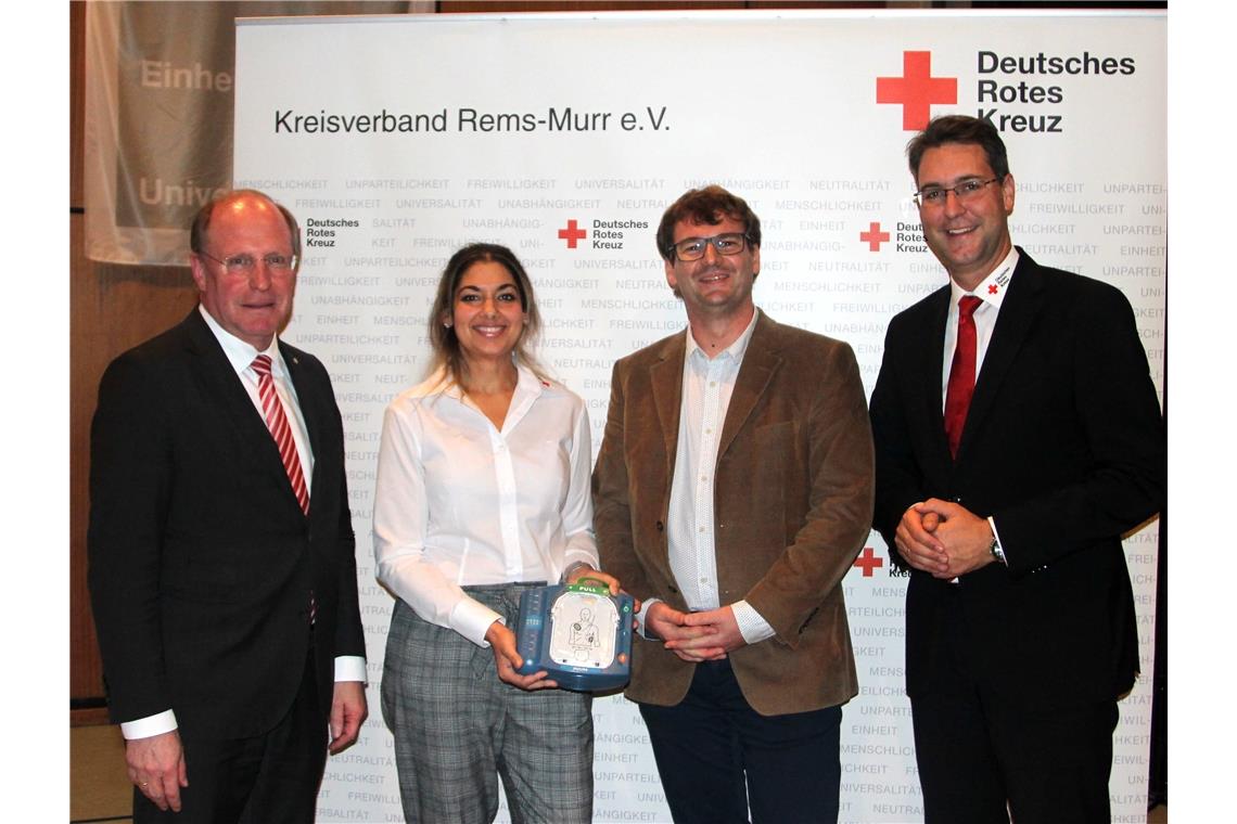 Staatssekretär Wilfried Klenk und Richard Sigel, Präsident des DRK-Kreisverbands, umrahmen Sina Löhle von der Kreisbereitschaftsleitung und Dr. Thomas Eul vom Kardioverein Rems-Murr. Für die Helfer vor Ort des DRK spendete die Kreisbaugesellschaft Waiblingen 10000 Euro. Von diesem Geld wurden zehn Defibrillatoren gekauft. Foto: C. Siekmann/DRK
