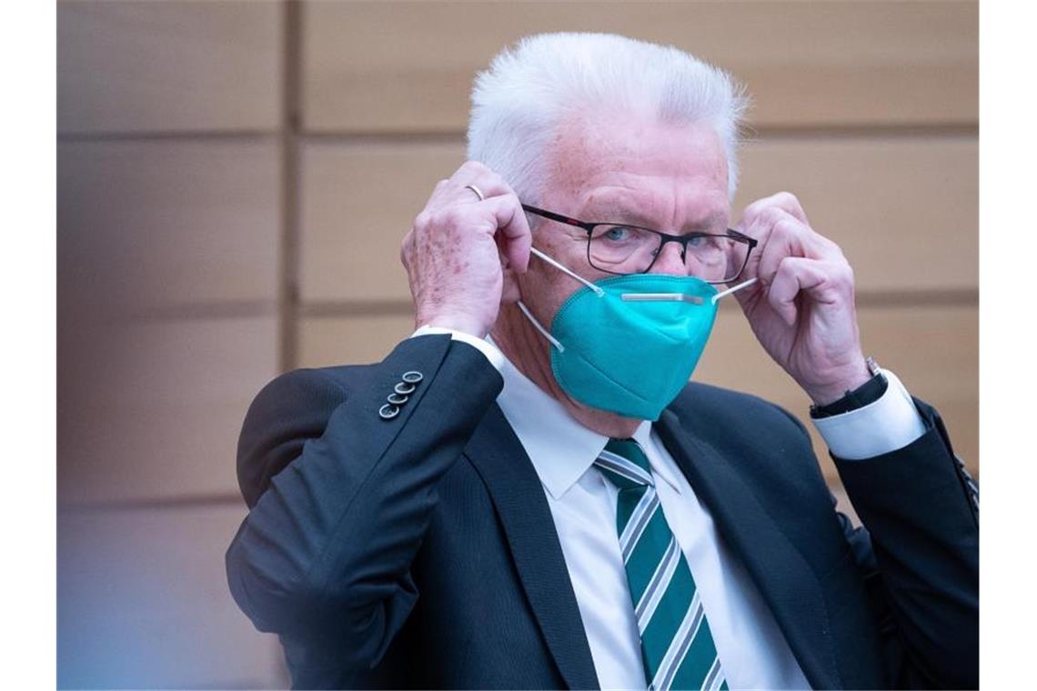Winfried Kretschmann (Bündnis 90/Die Grünen), Ministerpräsident von Baden-Württemberg, zieht einen Mund-Nasenschutz auf. Foto: Sebastian Gollnow/dpa/Archivbild