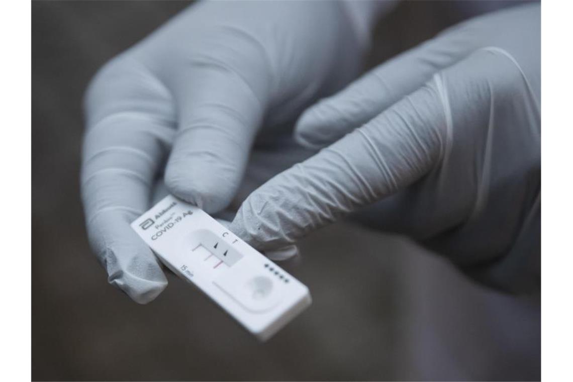 Ein Mitarbeiter des Roten Kreuzes hält einen Corona-Schnelltest in der Hand. Foto: Tom Weller/dpa/Symbolbild
