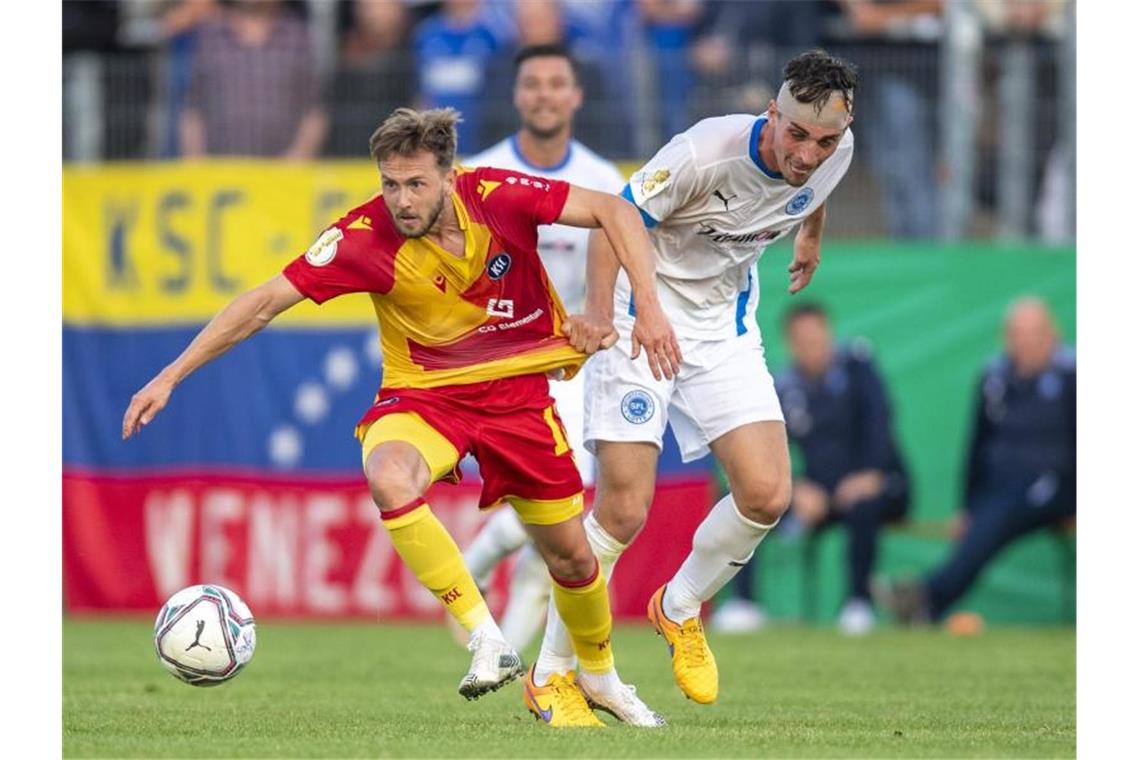 Karlsruhes Lucas Cueto (l) und Lottes Luis Allmeroth kämpfen um den Ball. Foto: David Inderlied/dpa