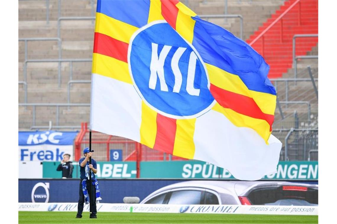 Ein Karlsruher Fan schwenkt vor leeren Zuschauerrängen eine Fahne mit der Aufschrift „KSC“. Foto: Uwe Anspach/Archivbild