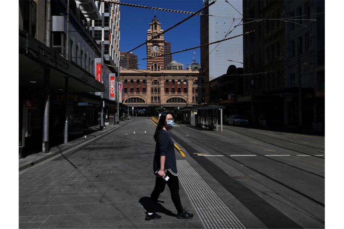 Eine Person mit Gesichtsmaske geht über die Straße in Melbourne. Foto: James Ross/AAP/dpa