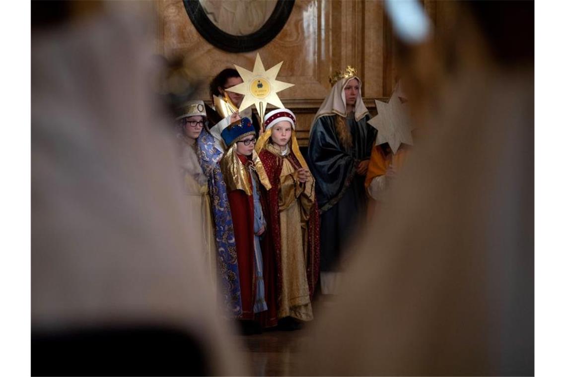 Sternsinger und Sternsingerinnen stehen im Marmorsaal des Neuen Schlosses. Foto: Marijan Murat/dpa/Symbolbild
