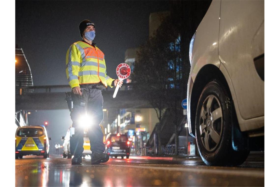 Ein Polizeibeamter bei einer Kontrolle zur Einhaltung der Ausgangsbeschränkungen in Stuttgart. Foto: Sebastian Gollnow/dpa/Archivbild
