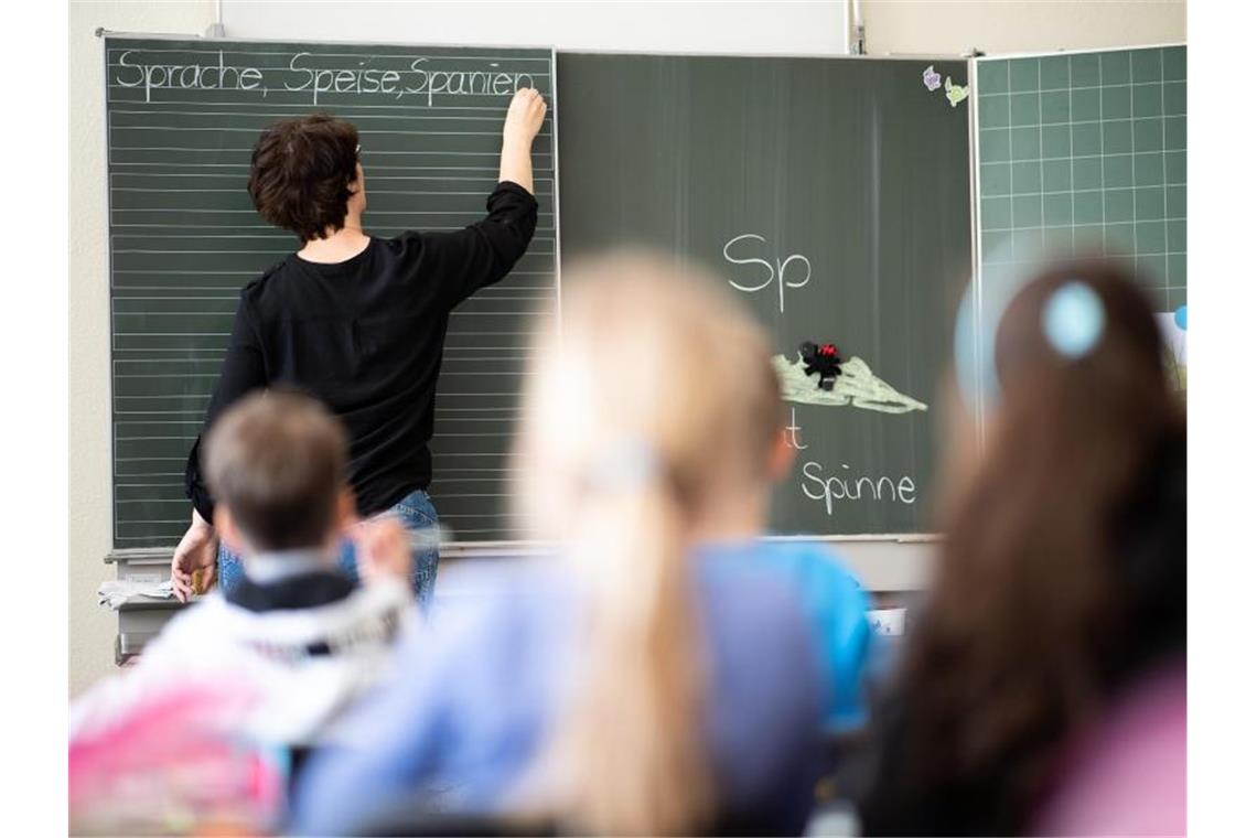 Eine Lehrerin schreibt in einer Schule an die Tafel. Foto: Sebastian Gollnow/dpa/Symbolbild