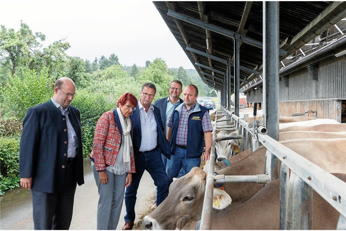 Bürgermeister Armin Mößner, CDU-Bundestagskandidatin Inge Gräßle, Landwirtschaftsminister Peter Hauk und Bauernverbandsvorsitzender Jürgen Maurer schauen sich im Milchviehbetrieb von Harald Wurst (von links) in Hinterwestermurr um. Foto: J. Fiedler