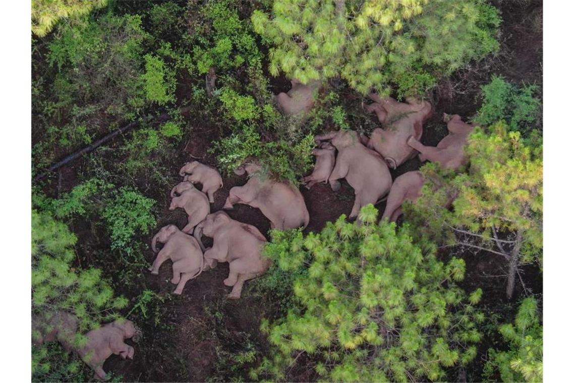 Die wandernde Elefantenherde weidet in einem Bezirk der Stadt Kunming im Südwesten der chinesischen Provinz Yunnan. Foto: Uncredited/Yunnan Forest Fire Brigade/AP/dpa