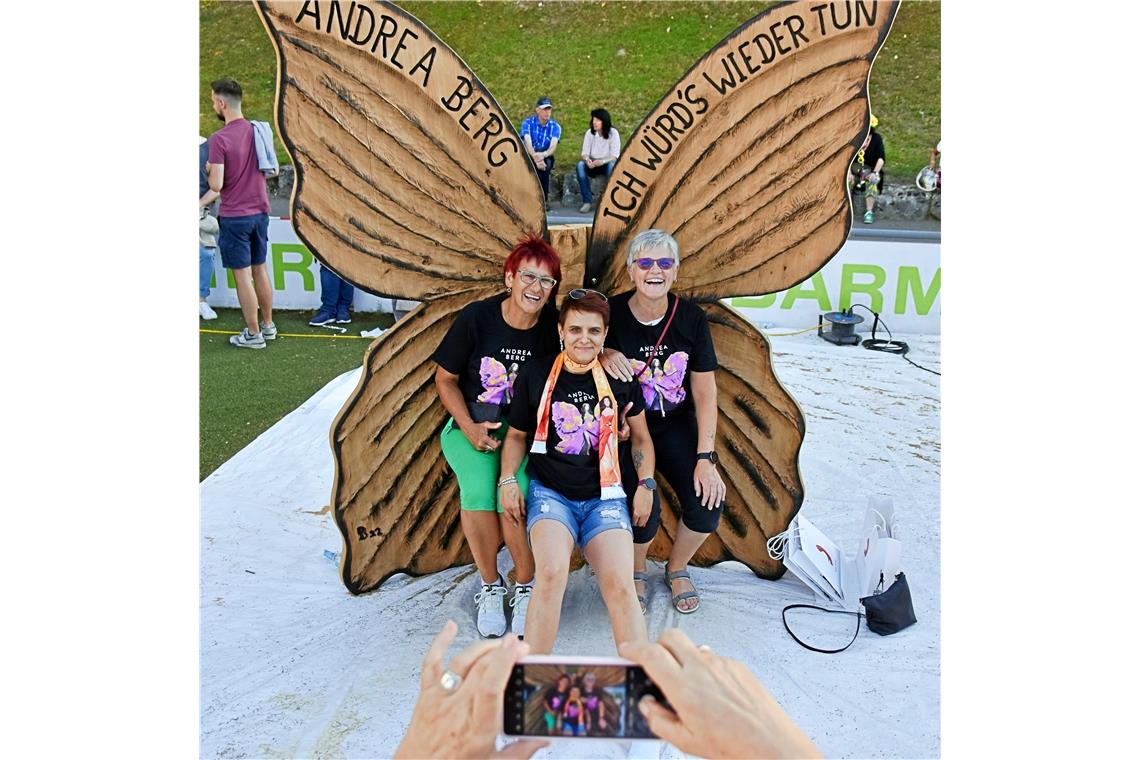 Ein ganz spezielles Bonbon für die Fans – „meine Weltpremiere für euch“ – ist der Song „Ich träum mich zurück“ aus ihrem neuesten Album. Und die Zeilen „wie ein Déjà-vu aus Glück, sing ich längst vergangene Lieder“ werden sofort begeistert mitgeträllert. Immer wieder betont Berg die Bedeutung dieses Konzerts für sie. „Das hier ist mein Zuhause. Heimat ist für mich kein Ort, das ist, wo Ihr seid, das ist ein Gefühl.“ Mehr Liebeszuwendung geht nicht. Und 15000 ziehen mit. Das tun sie auch, als ihre Andrea textlich fremdgeht und die Hits anderer deutscher Schlagerikonen anstimmt. „Die kleine Kneipe in unserer Straße“, „Über den Wolken“, „Sierra Madre“, „Seemann, lass das träumen“ oder Marmor, Stein und Eisen bricht“ werden aus vielen Kehlen mitgesungen und verwandeln das Stadion in einen riesigen Chor.