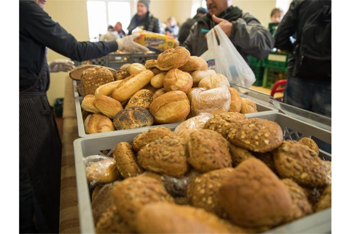Ehrenamtliche Tafel-Mitarbeiter bei der Verteilung von Brötchen. Foto: Daniel Karmann/dpa