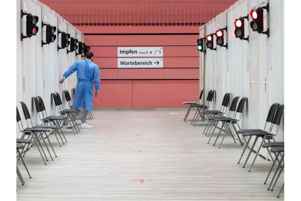 Ein Mitarbeiter des Impfzentrums Tübingen steht in der Paul-Horn-Arena in einem Gang. Foto: Marijan Murat/dpa/Archivbild