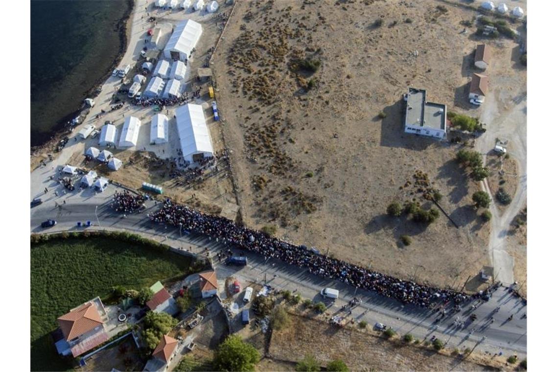 Eine größere Gruppe von Migranten wartet darauf, in das neue provisorische Flüchtlingslager gelassen zu werden. Foto: Petros Giannakouris/AP/dpa
