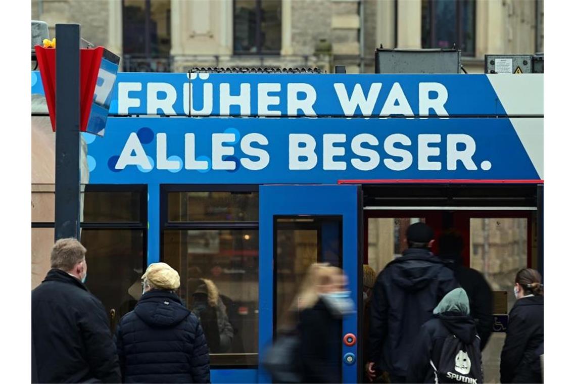 Fahrgäste mit Mund-Nasenschutz steigen im Zentrum von Halle/Saale aus einer Straßenbahn, über deren Eingang „Früher war alles besser“ zu lesen ist. Foto: Hendrik Schmidt/dpa-Zentralbild/dpa
