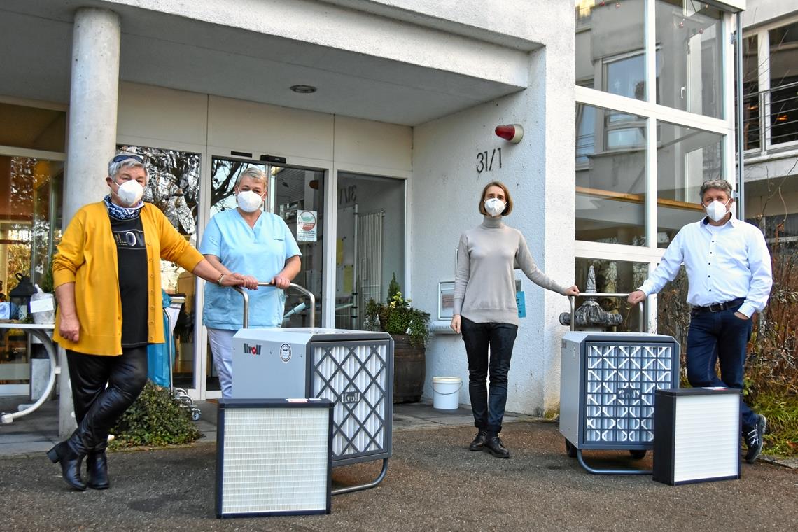 Julia Lochmann, Bettina Kleinknecht, Sabine Laible und Michél Lochmann (von links) hoffen, dass die Luftreiniger mit ihren speziellen Mikrofiltern die Mitarbeiter und Bewohner des Pflegestifts Bürgerheim in Backnang schützen. Foto: T. Sellmaier