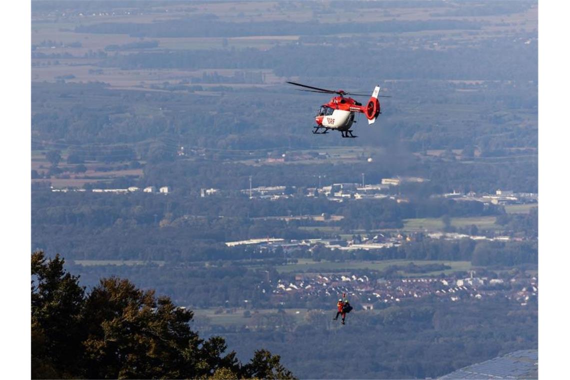 Einsatzkräfte der DRF Luftrettung sowie der Bergwacht hängen von einem Rettungshubschrauber am Seil. Foto: Philipp von Ditfurth/dpa