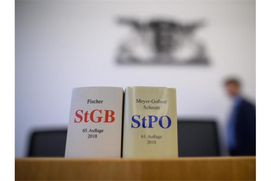Eine Ausgabe des Strafgesetzbuchs und der Strafprozessordnung stehen in einem Gerichtssaal. Foto: Sebastian Gollnow/dpa/Symbolbild
