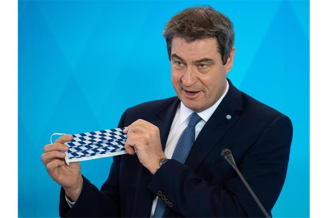 Markus Söder mit einem Mundschutz im Bayern-Stil. Foto: Sven Hoppe/dpa