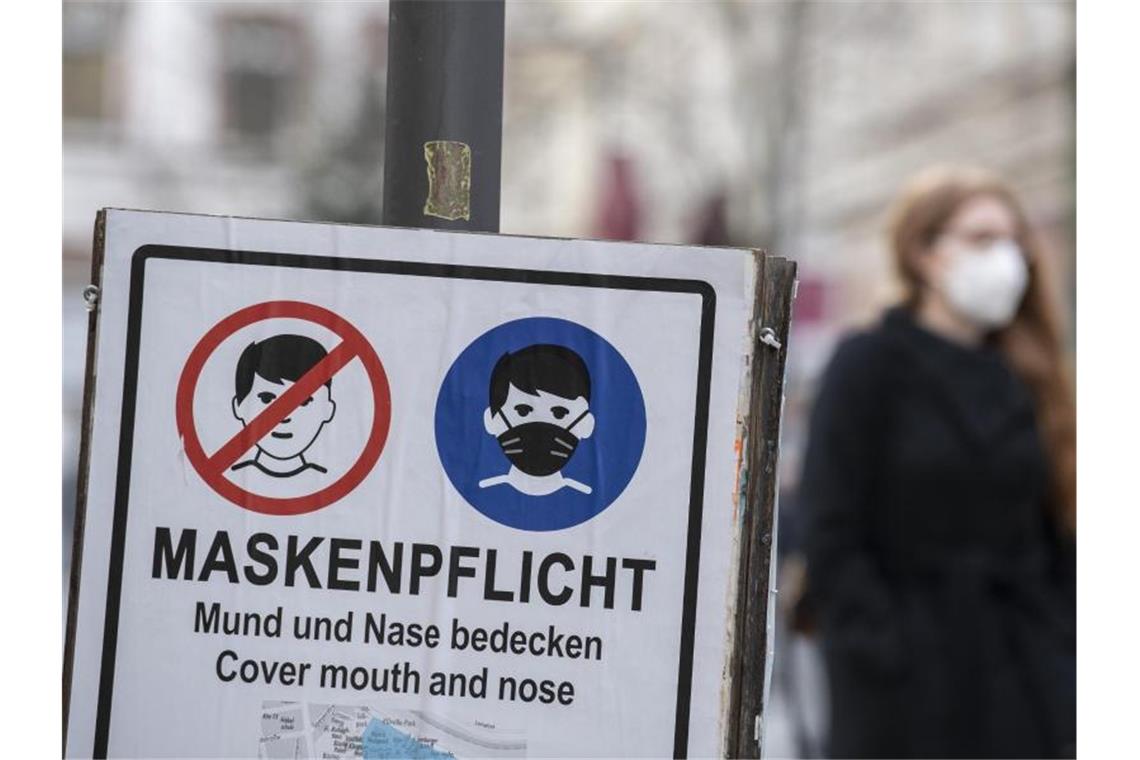 Plakate erinnern in einer Einkaufsstraße an die Einhaltung der Maskenpflicht. Foto: Boris Roessler/dpa/Symbolbild