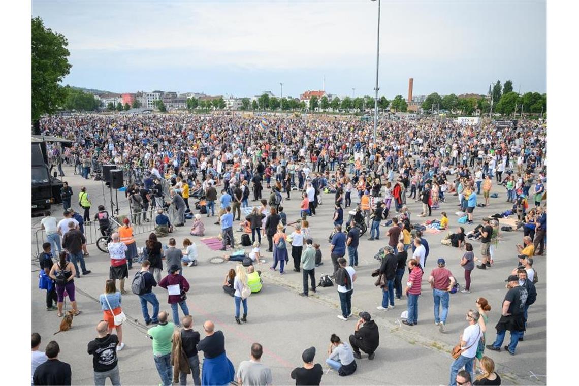 Demonstranten stehen auf dem Cannstatter Wasen. Foto: Sebastian Gollnow/dpa