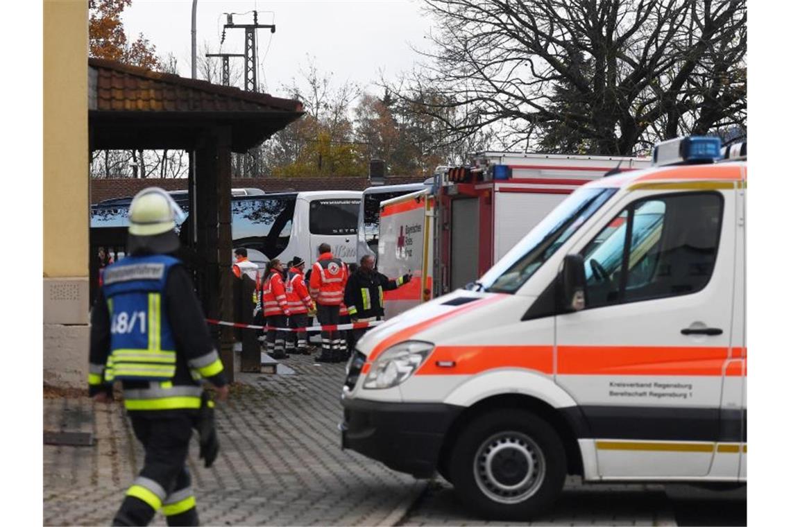Einsatzkräfte vor der Gaststätte in Seubersdorf, in der die Bahnreisenden am Samstag kurzzeitig untergebracht wurden. Foto: Angelika Warmuth/dpa