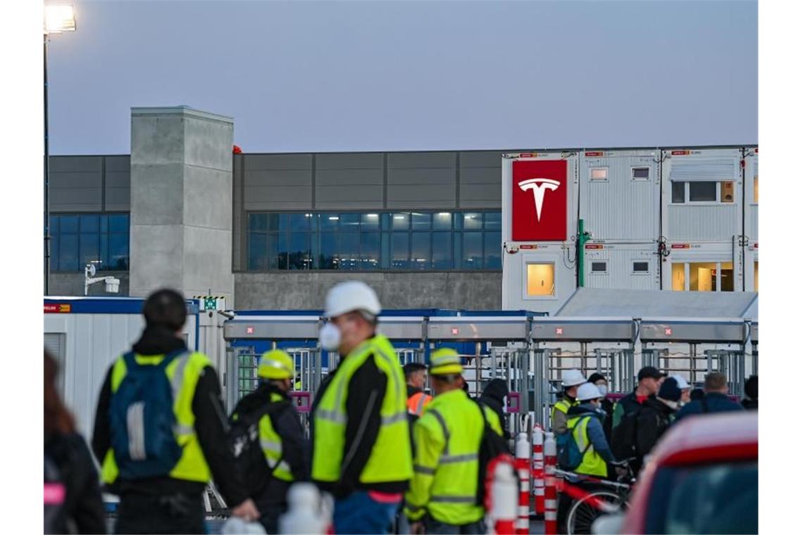 Arbeiter warten am frühen Morgen an einem Eingang zur Baustelle für die Tesla-Autofabrik. Foto: Patrick Pleul/dpa-Zentralbild/dpa