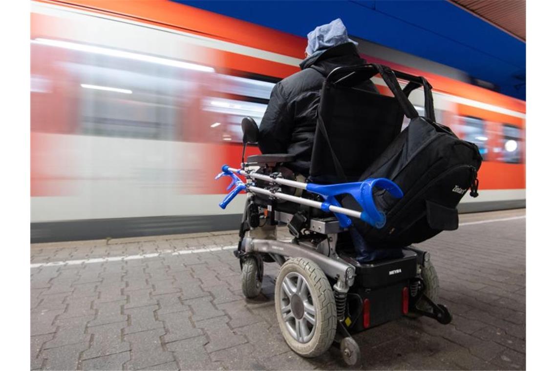 Steffen Gödecke steht mit seinem Elektro-Rollstuhl am Bahnhof Ludwigsburg an einem Gleis. Foto: Marijan Murat/dpa
