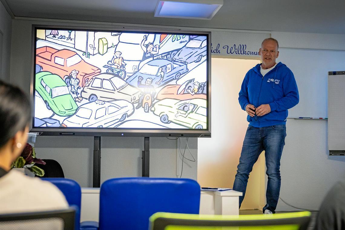 Bei der Vorbereitung auf die Theorieprüfung geht es Fahrschulinhabern wie Andy Rupp vor allem darum, Verknüpfungen zwischen Theorie und Praxis herzustellen. Denn auf vorausschauendes Denken kommt es in der Prüfung an, weniger auf Auswendiggelerntes. Foto: Alexander Becher