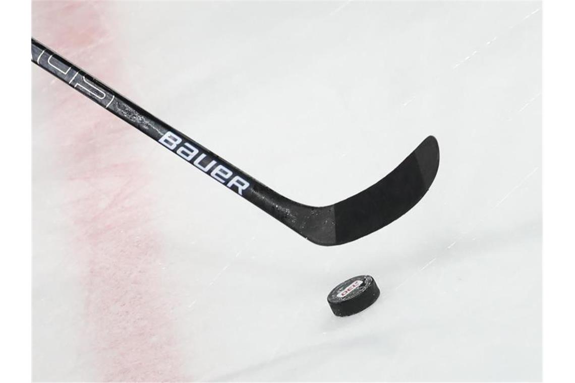 Ein Puck liegt vor einem Eishockey-Schläger auf dem Eis. Foto: Daniel Karmann/dpa/Symbolbild