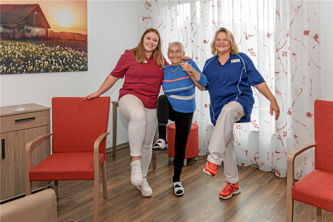 Als Ergo-Scouts motivieren Laura Kübler (links) und Anette Erb (rechts) nicht nur ihr Team, sondern auch die Bewohner, sich zwischendurch zu bewegen – so wie die 94-jährige Olga Demel, die beim Einbeinstand mitmacht. Foto: Stefan Bossow