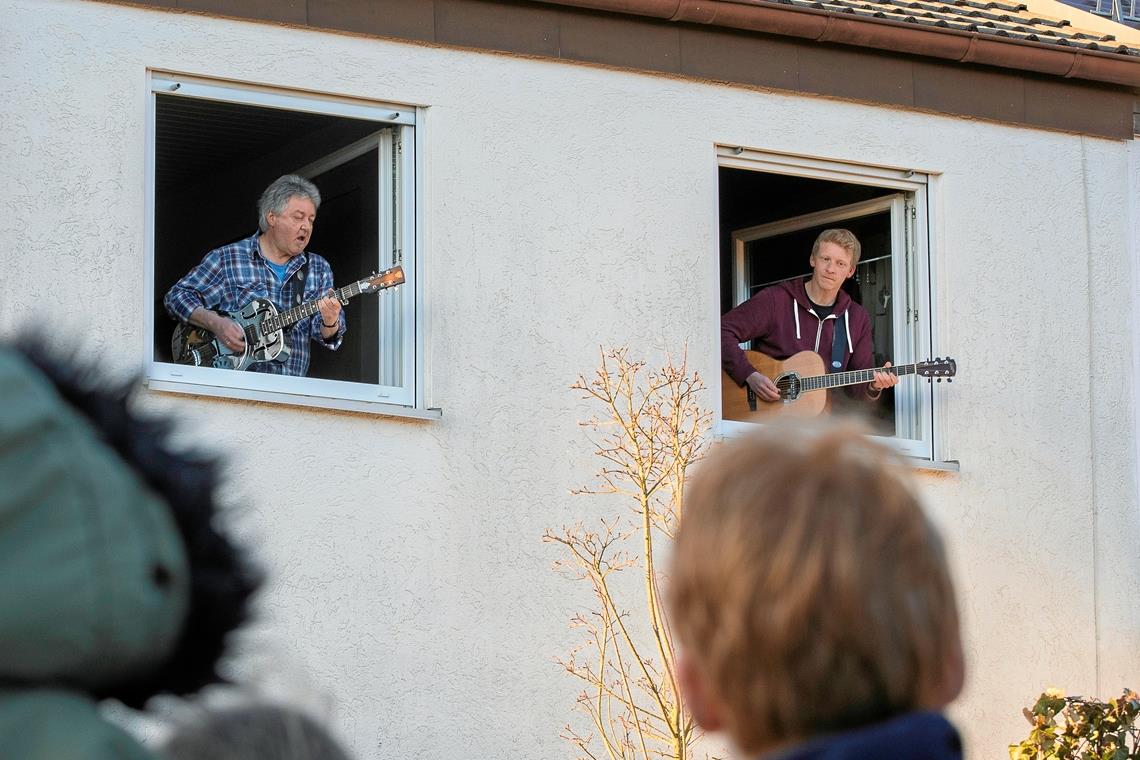 Udo Hauenstein (links) und Sohn Peter musizieren aus ihrer Wohnung heraus. Foto: A. Becher