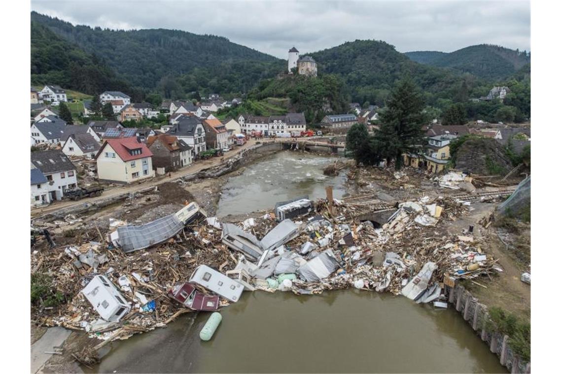 Meterhoch türmten sich wenige Tage nach der Flut Mitte Juli Wohnwagen, Gastanks, Bäume und Schrott an einer Brücke über die Ahr in Altenahr-Kreuzberg. Foto: Boris Roessler/dpa