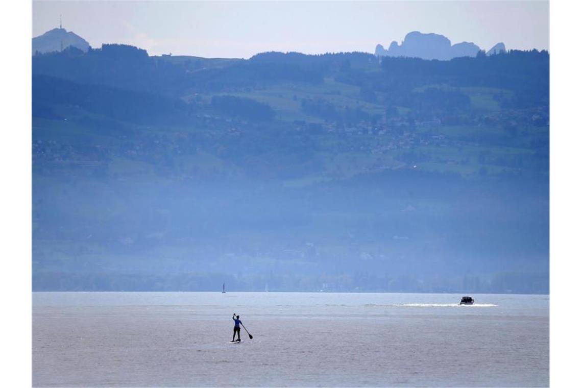 Stand-up-Paddler auf dem Bodensee. Bei Temperaturen jenseits der 20-Grad-Marke verbrachten viele Menschen das Wochenende im Freien. Foto: Karl-Josef Hildenbrand/dpa