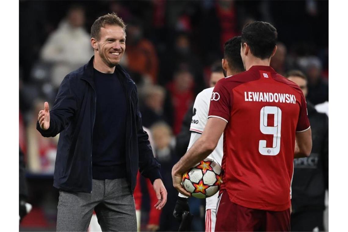 Münchens Trainer Julian Nagelsmann (l) gratuliert. Foto: Sven Hoppe/dpa